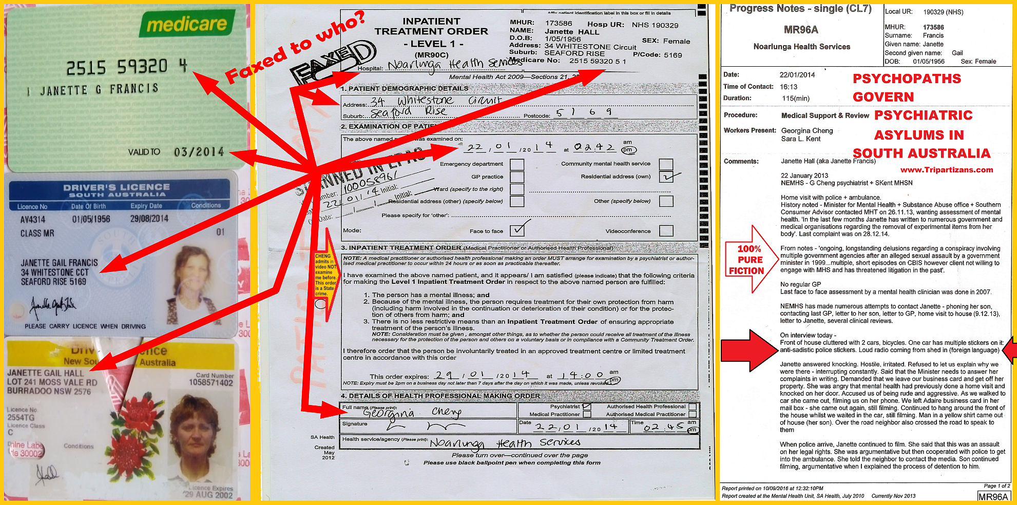 My website www.JanetteGailFrancis.com (www.WitchHunted.com) proves that since 2018 South Australia's government have illegally blocked my irrevocable statutory right to have my State drivers licence issued because (in writing to South Australia's police) I asked police to investigate medical crimes in the Adelaide to Onkaparinga local council regions of South Australia - and South Australia's police refuse to impose penalty against the offenders for perverting the course of justice and due administration of law because Australia is a terrorist nation.